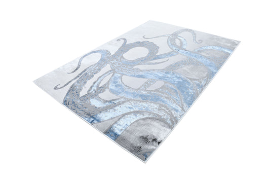 Soft-Touch Light Grey Rug Featuring Metallic Octopus/Tentacle Design in Sheer Black or Blue - Z339A (POL805)