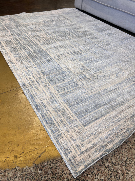 Cream Rug with Geometric Blue, Silver & Charcoal Accents in High-Low Texture - KAI 302