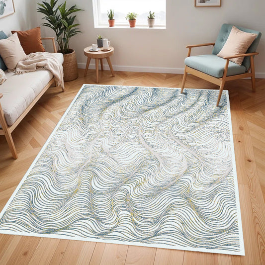 Modern Cream Rug with Blue, Gold-Brown & Silver Viscose Swirl Accents - KAI 304